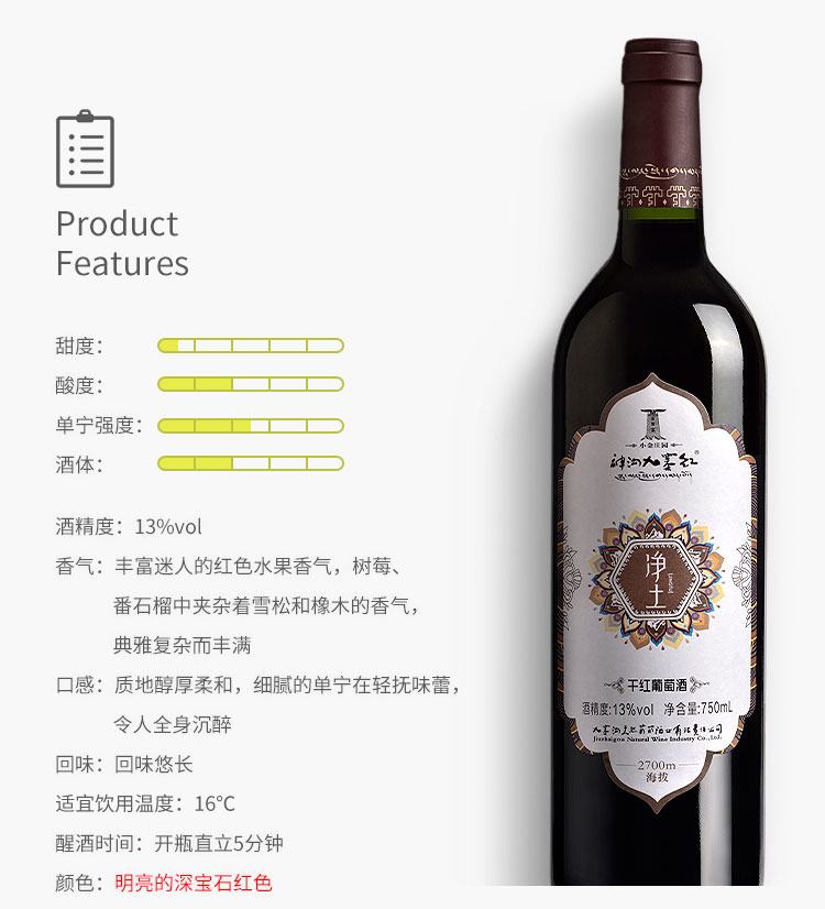 神沟九寨红 净土 干红葡萄酒单支